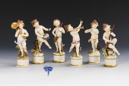 Je auf einem Rundsockel an einem Baumstamm stehender oder sitzender Putto mit Trommel, Dudelsack, Fagott, Horn, Schalmei bzw. Querflöte