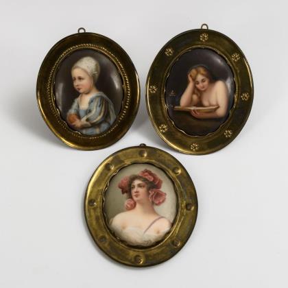 Kleine, ovale Bildplatten im Messingrahmen. 1x signiert "Wagner" mit Damenporträt, 1x mit der Darstellung des Kindes "Baby Stuart" nach Anthony van Dyck, 1x mit der Darstellung der büßenden Magdalena