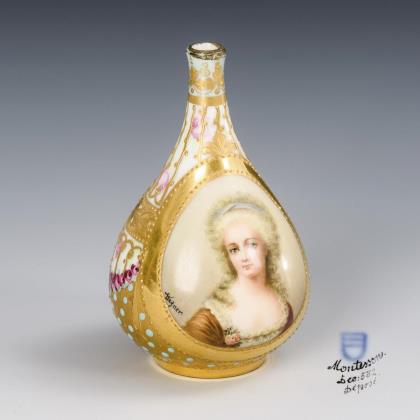 Birnvase mit dem schauseitig gemalten, unterseitig bezeichneten Bildnis der Madame de Montesson, nach einem Gemälde von Élisabeth Vigée Le Brun; verso Blumen- und Reliefgoldmalerei sowie türkisfarbene Juwelenmalerei
