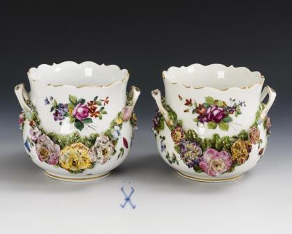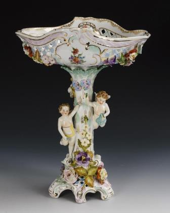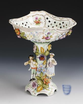 Mit Rosengirlanden und Vergißmeinnichtkränzen belegte Durchbruchschale, auf Stammschaft mit einem am Schaft stehenden Gärtnerkinderpaar, Rocaillesockel mit drei Füßen und Blütenbelag
