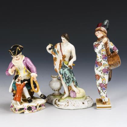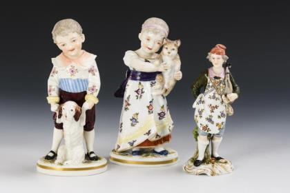 1x Schierholz: elegante Modedame im geblümten Kleid mit Hut und Muff (H 18 cm). / 1x Knabe mit Hund und Reifen (H 13 cm). / 1x Bacchant mit Weintraubenzepter und Pelzumhang (H 15,5 cm)