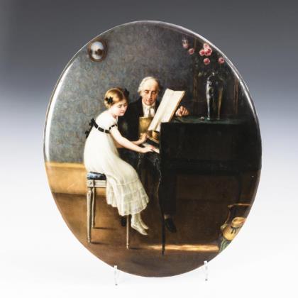 Ovale Bildplatte mit der Darstellung eines Mädchens am Klavier, hinter dem Klavier der Klavierlehrer sitzend, nach einem 1911 entstandenen Gemälde von Jules-Alexis Muenier (1863-1942)