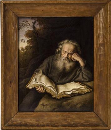 Rechteckige Platte mit der Darstellung des in einer Landschaft sitzenden, studierenden Eremiten, nach einem Gemälde von Salomon Koninck (1609-1656)
