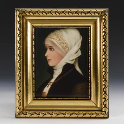 Rechteckige Bildplatte mit der Darstellung einer jungen Frau im Renaissancekostüm