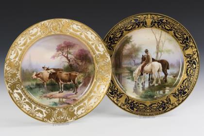 1x signiert "P.V.": kobaltblaue Fahne mit ornamentaler Reliefgoldmalerei, im Spiegel die Darstellung eines seine zwei Pferde am Fluss tränkenden Bauern. / 1x signiert "C. May": weißer Fahnenfond mit prunkvoller, ornamentaler Reliefgoldmalerei, im Spiegel die Darstellung von drei Kühen am Fluss