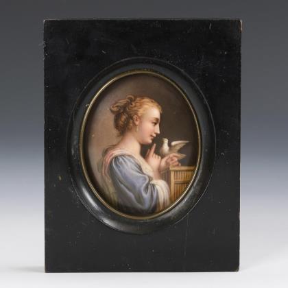 1x ovale Bildplatte mit der Historismus-Darstellung einer jungen Frau im historischen Kostüm (L 16,5 cm, L mit Holzrahmen 20,5 cm). / 1x ovale Bildplatte mit der Darstellung einer Vestalin nach Angelika Kauffmann (1741-1807) (L 13 cm, L mit Holzrahmen 24,5 cm)