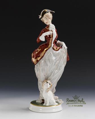 Rokokodame im Reitkostüm, zu ihren Füßen ein Hund sitzend