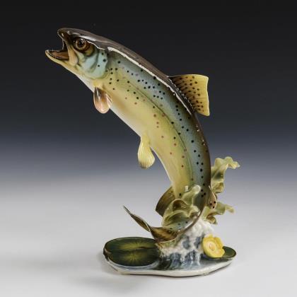 2x Bing & Gröndahl: Vase mit Landschaftsmalerei (H 21 cm) und Forelle (L 16 cm). / 2x Royal Copenhagen: Deckelvase mit Vogelmalerei (H 15 cm) und Mädchen mit Tuch (H 14,5 cm). / 1x Dahl-Jensen: sitzender King Charles Spaniel (H 10 cm)