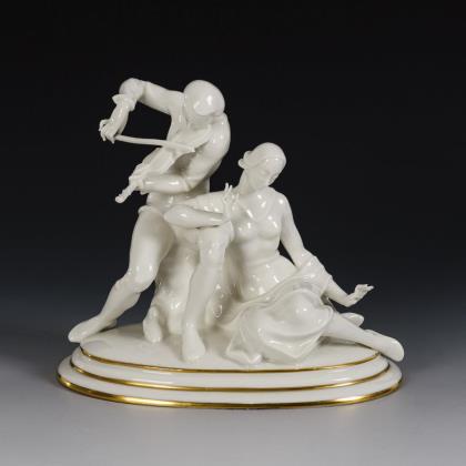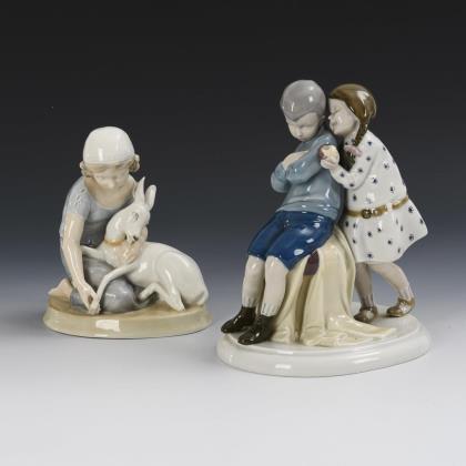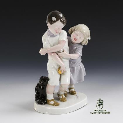 1x Heubach, 1905-1945, Modell-Nr. 10543: Auf einem Ovalsockel kniendes Mädchen mit Reh, am Sockel bezeichnet "Brüderlein und Schwesterlein" (H 16,5 cm). / 1x Goebel Wilhelmsfeld, 1919-1936, Modell-Nr. 828, bezeichnet "Lund": einem schmollenden Knaben einen Apfel reichendes Mädchen (H 20,5 cm)
