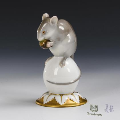 Auf einer Kugel sitzende, eine Nuss essende Maus
