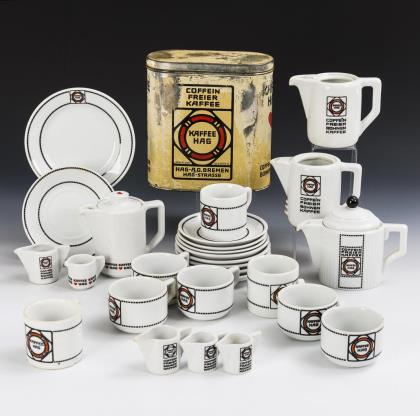 Hotelporzellan. Schauseitig jeweils das Logo der Kaffeemarke "Kaffee Hag". 4 verschiedene Kännchen (davon 2 ohne Deckel; H 10-13 cm), 5 Milchkännchen (H 4-5 cm), 5 + 3 Tassen (H 4,5 und 6,5 cm), 6 + 3 Untertassen (Ø 14 und 13,5 cm) und 1 Teller (Ø 17 cm). Dazu eine Kaffeedose "Kaffee Hag" (H 21,5 cm)