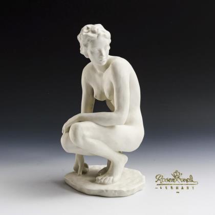 Auf einer Rechteckplinthe kniender Frauenakt, mit den Händen Wasser trinkend