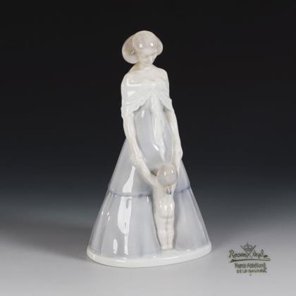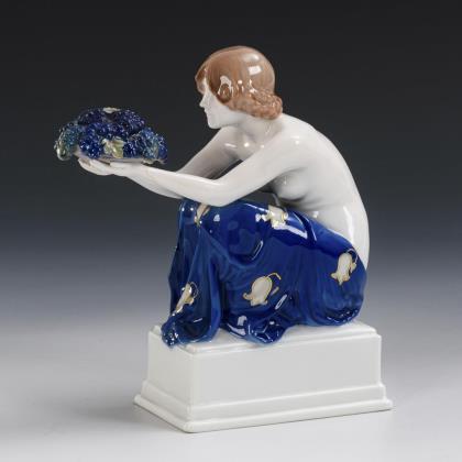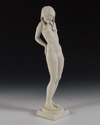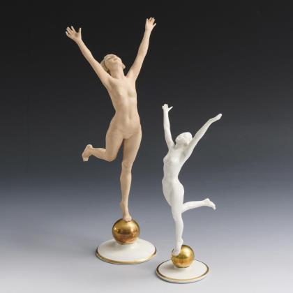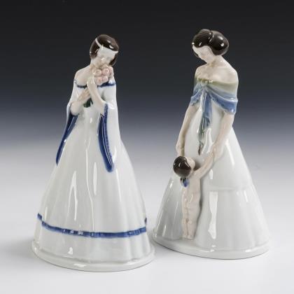 1x Modell-Nr. K 304: Jugendstil-Plastik einer jungen Frau im langen Kleid, eine kleine Elfe an den Händen haltend. / 1x Modell-Nr.: K 303: stehende junge Frau, an einem Rosenstrauß riechend