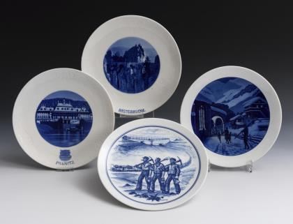 Halbovoide Plattschale, schauseitig die Darstellung eines Hahnes mit zwei Hühnern