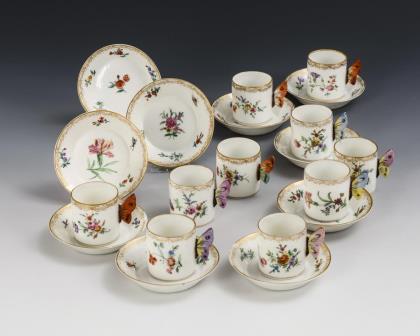 118 Teile. 12 Suppentassen mit 11 Untertassen, 12 Speiseteller, 11 Brotteller, 12 Salatteller, 12 Kompottschälchen, 2 Schüsseln (Ø 25 cm), 2 + 2 Saucieren (L 18,5 und 23 cm), 1 Henkelschale (L 35,5 cm), 2 + 2 Platten (L 26 und 33 cm), 2 Kaffeekannen, 2 Milchkännchen, 2 Zuckerdosen, 12 Kaffeetassen mit 12 Untertassen, 1 Butterdose, 1 Konfitürendose, 4 Gewürzstreuer und 1 Tortenplatte