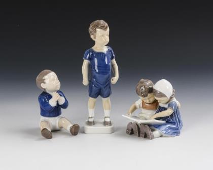 1x Modell-Nr. 1617: stehender Knabe (H 20 cm). / 1x Modell-Nr. 2337: sitzender, in die Hände klatschender Knabe (H 11 cm). / 1x Modell-Nr. 1567: sitzendes, sich ein Buch anschauendes Kinderpaar (H 9,5 cm)