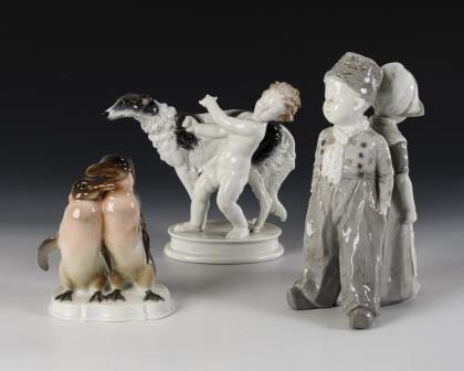 1x Heubach: Kinderpaar in holländischer Tracht (H 23 cm). / 2x Rosenthal: Modell-Nr. 693, Pinguinpaar (H 14,5 cm) und Modell-Nr. 1282, Knabe mit Windhund (H 17,5 cm)