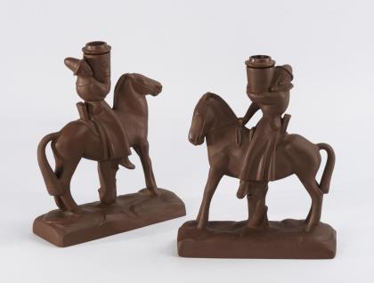Je ein Reiter, einen Korb als Leuchter tragend, mit Tülleneinsatz. Pendantfiguren