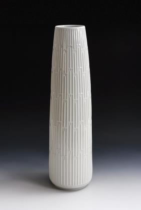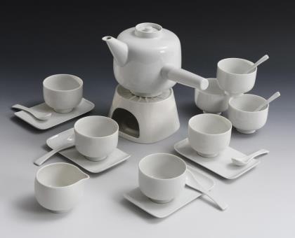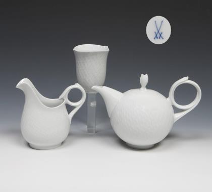 Aus dem neuen Service zur Jahrtausendwende. Modell von Sabine Wachs und Jörg Danielczyk. Dekor "Wellenspiel, Relief". Fassungsvermögen 0,25; 0,45 und 1 Liter. Pressmarken, Schwertermarken