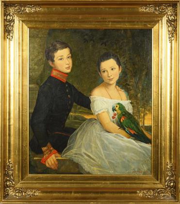 Porträts eines jungen Mannes im grünen Gehrock mit Stehkragen und einer jungen Frau mit gelocktem Haar und in blauem Kleid