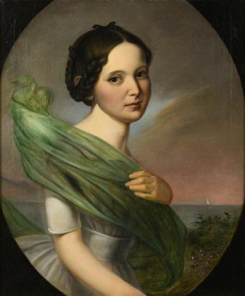 Qualitativ hochwertiges, oval gemaltes Bildnis einer jungen Frau mit wehendem Tuch vor romantischer Küstenkulisse