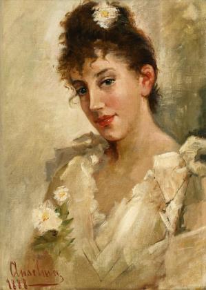 Bildnis einer jungen Frau im weißen Kleid mit Blumen am Dekolleté und im Haar