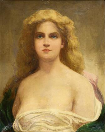 Porträt einer jungen Frau mit langem, blondem Haar und antikisierendem Gewand
