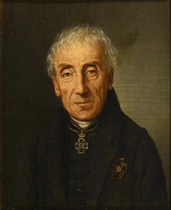 Porträt eines älteren Mannes in schwarzer Kleidung mit fein gemalten Orden vor neutralem Hintergrund