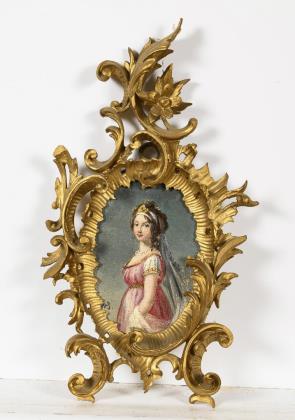 Porträtminiatur im prunkvollen Rahmen aus dem 19. Jahrhundert. Breiter geschnitzter Mahagoni-Rahmen mit Ornament- und Blütendekor