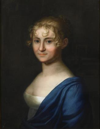 Bildnis einer Frau mit lockigem, hochgestecktem Haar im blauen Kleid vor dunklem Hintergrund