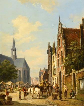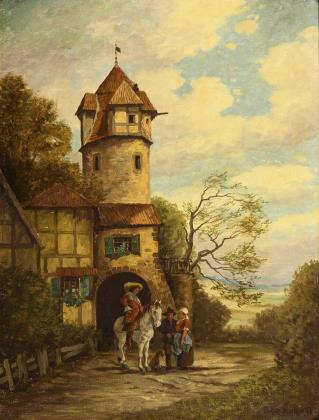 Eine figurenreiche beschwingte Szene mit abwechslungsreicher Schilderung in südlicher Architektur-Landschaft. Rückseitig Reste eines alten Klebezettels. Aufwendig gearbeiteter profilierter Goldrahmen mit goldenem Ornamentdekor auf dunkelgrünem Fond