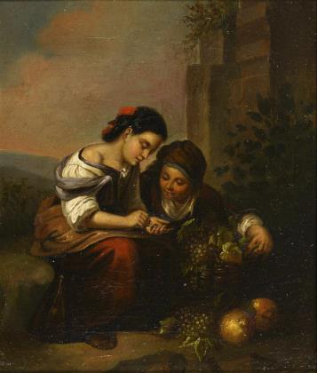 Kleinformatige Szene aus der Lebenswelt heranwachsender Jünglinge, mit einer einfühlsamen Empfindung geschildert. Profilierter Waschgoldrahmen