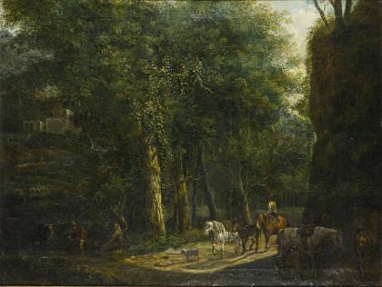 Reiter mit mehreren Pferden auf einem Weg am Waldrand nahe einer Ortschaft mit Hirte und Rindern beim Flussufer