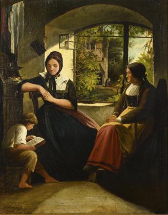 Genreszene mit zwei Frauen und einem lesenden Jungen am geöffneten Fenster