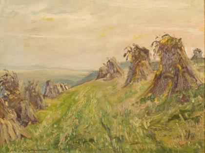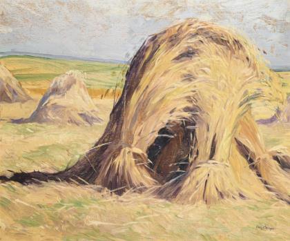 Heugarben, im hellen Sonnenschein in weiter Felderlandschaft | Nachtrag 17.2.24: Otto Lange (1878 Sömmerda - 1956 Nordhausen), Deutscher Maler und Lehrer