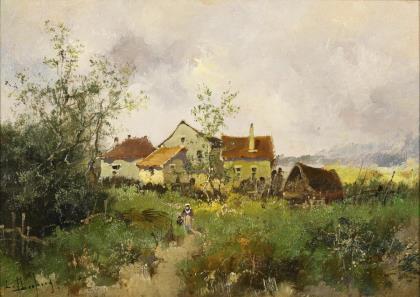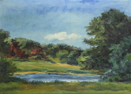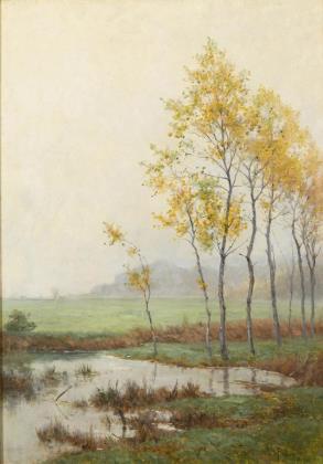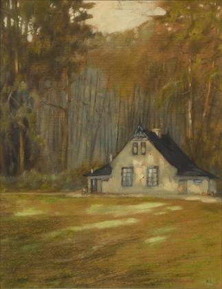 Ein schlichtes Motiv mit farblichem Nuancereichtum, eine Freilichtmalerei mit natürlichen Licht- und Luftverhältnissen. Profilierter Goldrahmen mit weiß gefasster Leiste und Leinenbezug