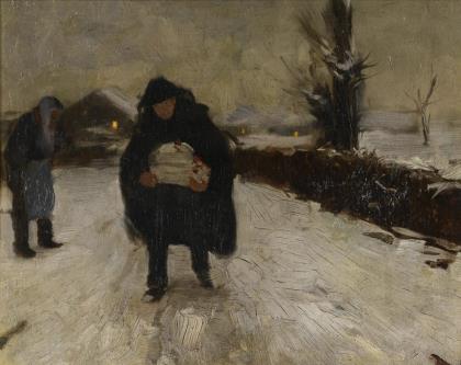 Undeutlich signiert: Verschneite Straße mit Personen.