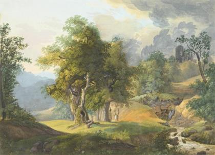 Landschafts-Miniatur mit Figurenstaffage und einem weiten Ausblick in die Ferne in hellem Kolorit. Breiter vergoldeter Stuckrahmen