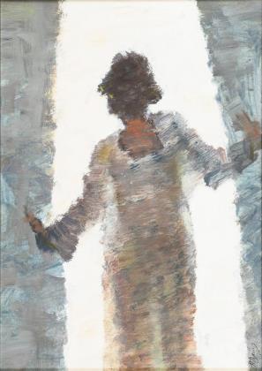 Schemenhaft gemalte Frau im leicht transparenten Nachthemd beim Öffnen der Vorhänge