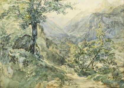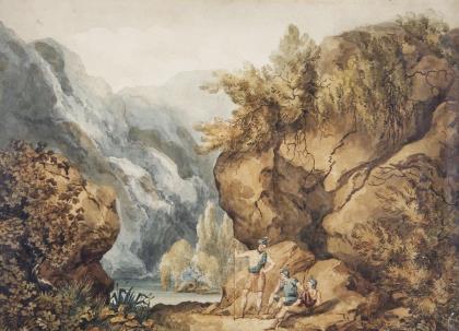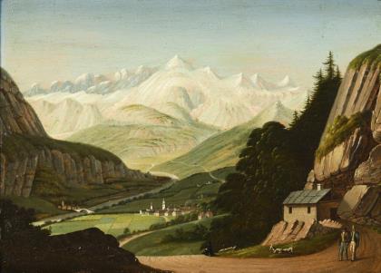 Staffagefiguren auf einem Weg Blick in die bergige Landschaft