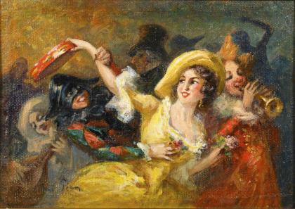 PÉAN, René Louis (1875 Paris - 1955 Emont). Karnevalszene mit Harlekin und Musikanten.