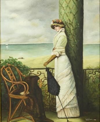 Junge Frau im weißen Kleid mit Schirm und Hut auf einem Balkon mit Blick aufs Meer