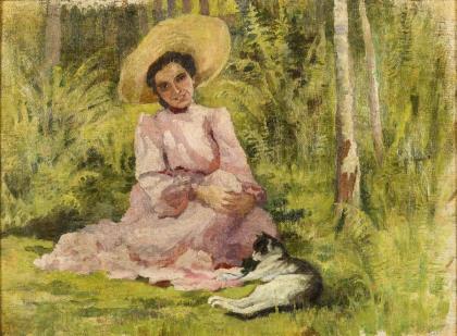 Freundlich den Betrachter anblickende junge Frau mit einer Katze auf der Wiese vor den Bäumen