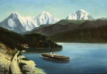 SCHUMACHER, W.. Beatenbucht am Thunersee mit Mönch und Jungfrau.