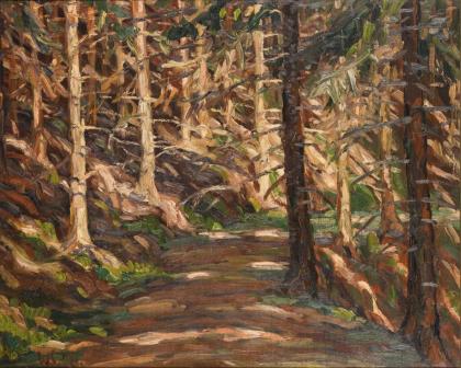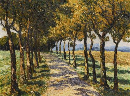 Pastos gemalte kleine Allee mit dicht stehenden, schlanken Bäumen zwischen Feldern