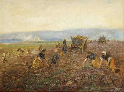 Die Dorfbewohner auf dem Feld beim Ernten der Kartoffeln unter grauem Himmel