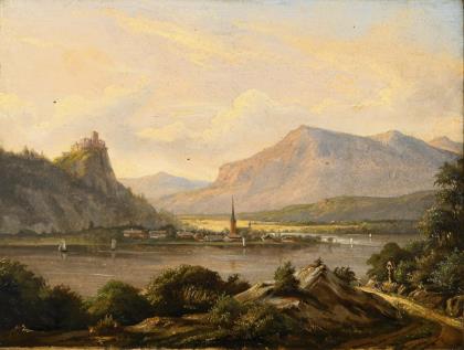 Idyllische Berglandschaft, wohl an Rhein oder Mosel, mit Ortschaft am Ufer unterhalb einer Burgruine