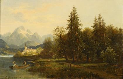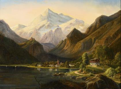 Berglandschaft mit See und Staffage nahe einem kleinen Ort