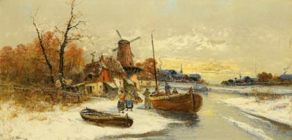 In der Art von Charles Leickert gemalte Landschaft mit vereistem Fluss in flacher Ebene nahe einem Dorf mit Windmühle und Staffage