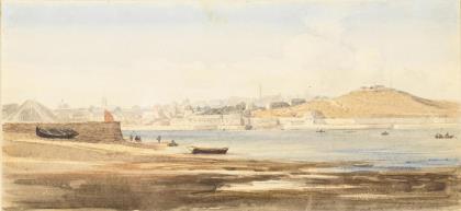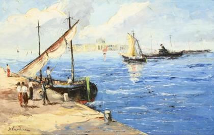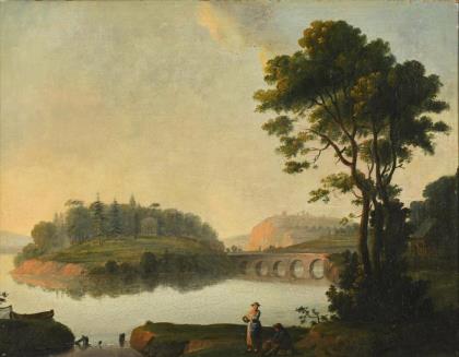 VICKERS, A.. Flusslandschaft mit Dorf und Fischerboot.